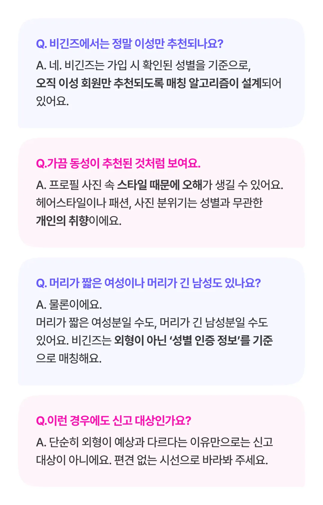 비긴즈는 믿을 수 있는 만남을 제공하기 위해 아래 원칙을 엄격하게 준수하고 있어요.