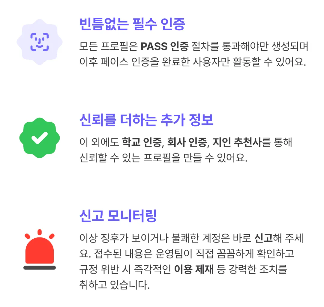 회원 수를 부풀리거나 매칭을 유도하기 위해 알바 계정 혹은 가짜 계정을 운영하지 않습니다.